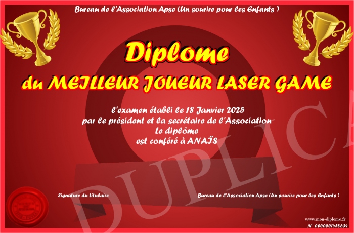 Envoyez par email votre Diplôme du MEILLEUR JOUEUR LASER GAME personalisé