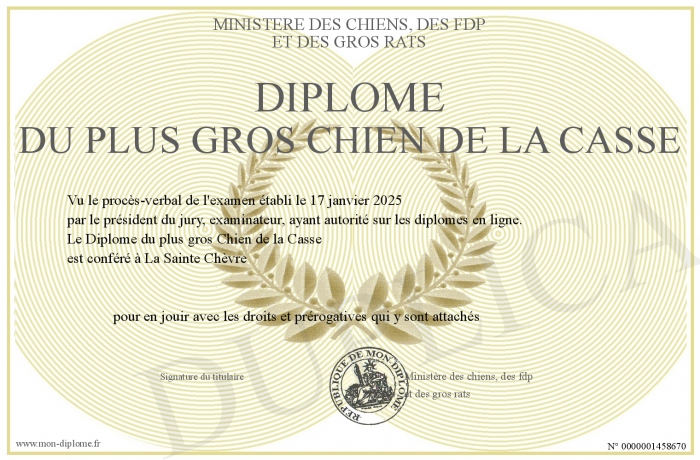 Envoyez par email votre Diplôme du plus gros Chien de la Casse personalisé