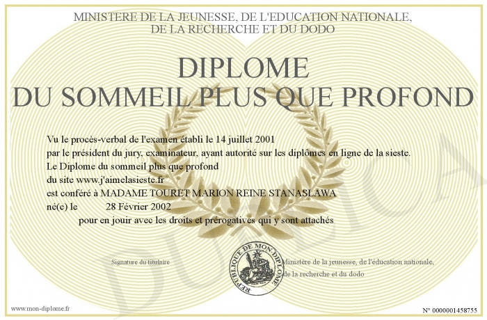 Envoyez par email votre Diplôme du sommeil plus que profond personalisé