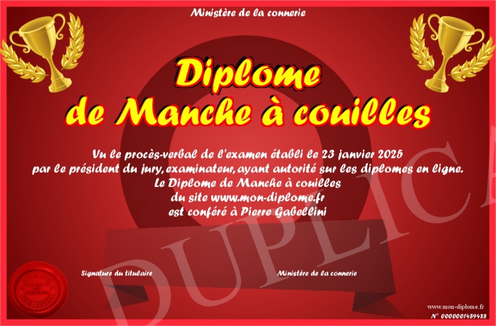 Envoyez par email votre Diplôme de Manche à couilles personalisé