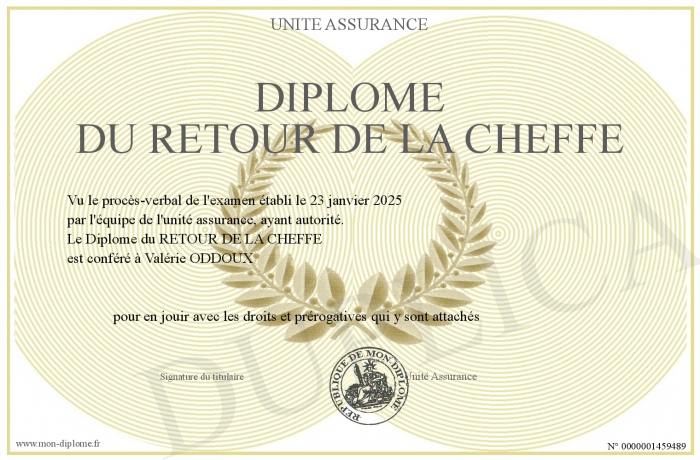 Envoyez par email votre Diplôme du RETOUR DE LA CHEFFE personalisé