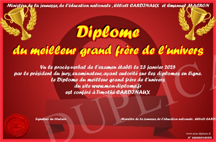 Envoyez par email votre Diplôme du meilleur grand frère de l'univers personalisé