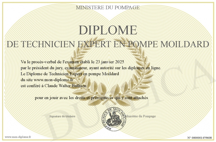 Envoyez par email votre Diplôme de Technicien Expert en pompe Moildard personalisé