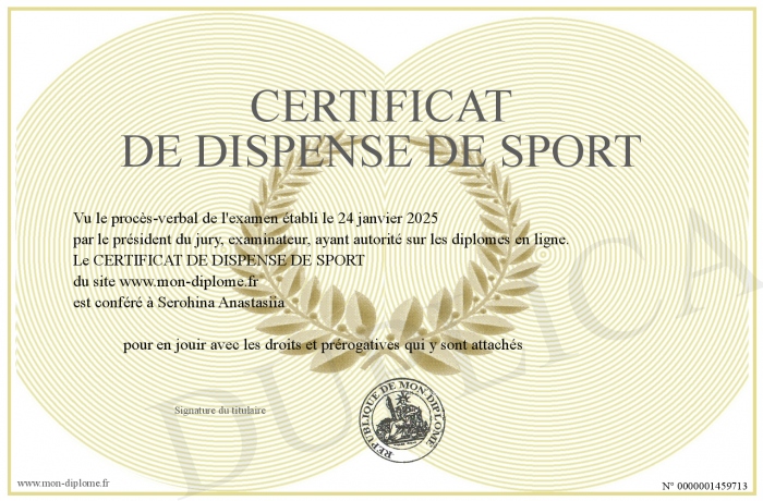 Envoyez par email votre CERTIFICAT DE DISPENSE DE SPORT personalisé