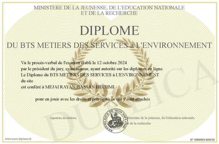 Envoyez par email votre Diplôme du BTS METIERS DES SERVICES à L'ENVIRONNEMENT personalisé