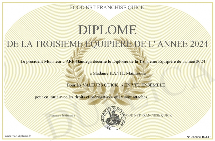 Envoyez par email votre DIPLOME DE LA TROISIEME EQUIPIERE DE L' ANNEE 2024 personalisé