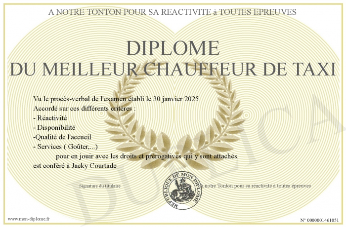 Envoyez par email votre Diplôme du meilleur chauffeur de taxi personalisé