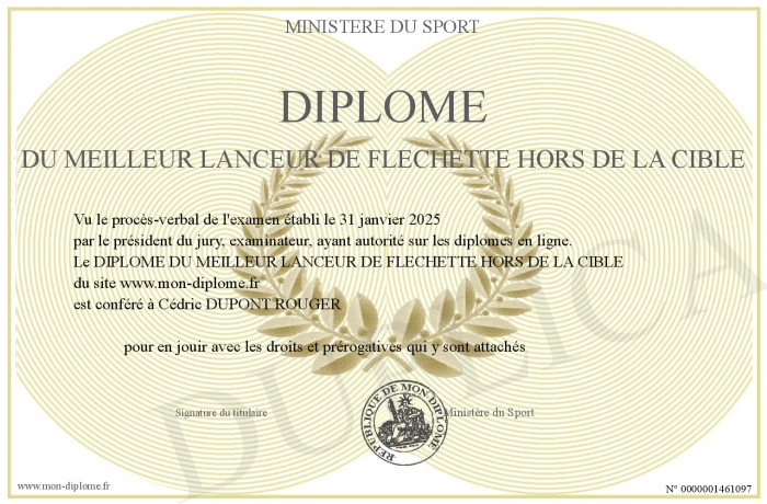 Envoyez par email votre DIPLOME DU MEILLEUR LANCEUR DE FLECHETTE HORS DE LA CIBLE personalisé