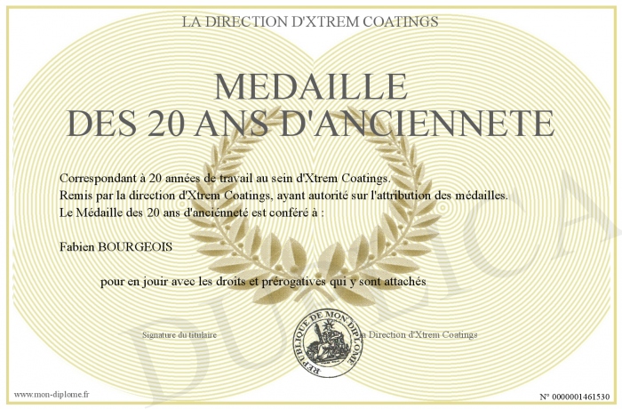 Envoyez par email votre Médaille des 20 ans d'anciénneté personalisé