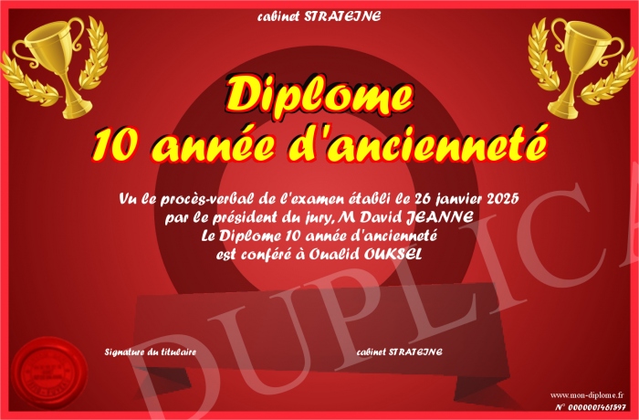 Envoyez par email votre Diplôme 10 année d'ancienneté personalisé
