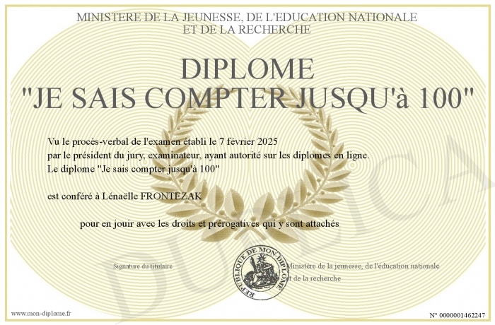 Envoyez par email votre diplôme -Je sais compter jusqu'à 100- personalisé