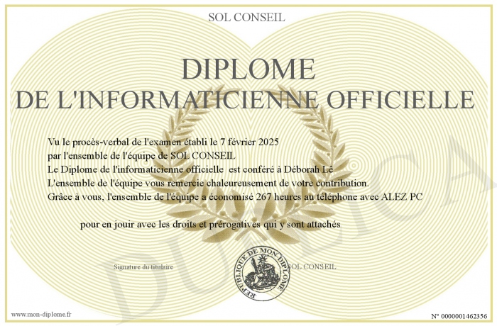 Envoyez par email votre Diplôme de l'informaticienne officielle personalisé