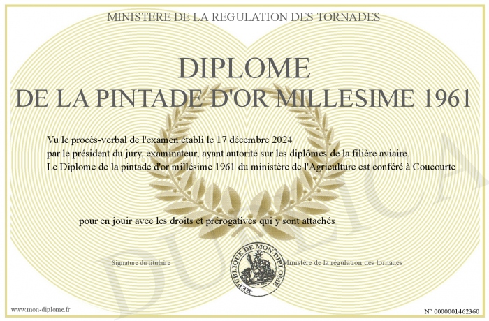 Envoyez par email votre Diplôme de la pintade d'or millésime 1961 personalisé