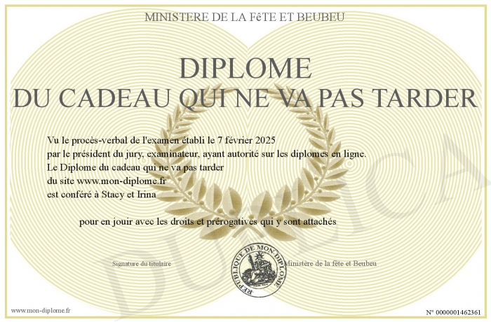 Envoyez par email votre Diplôme du cadeau qui ne va pas tarder personalisé