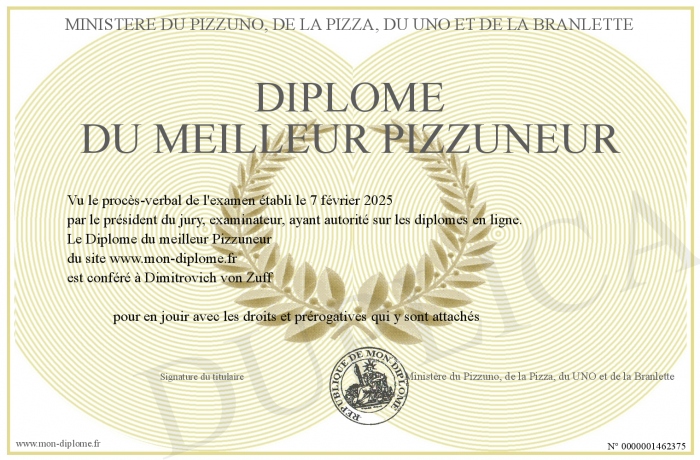 Envoyez par email votre Diplôme du meilleur Pizzuneur personalisé