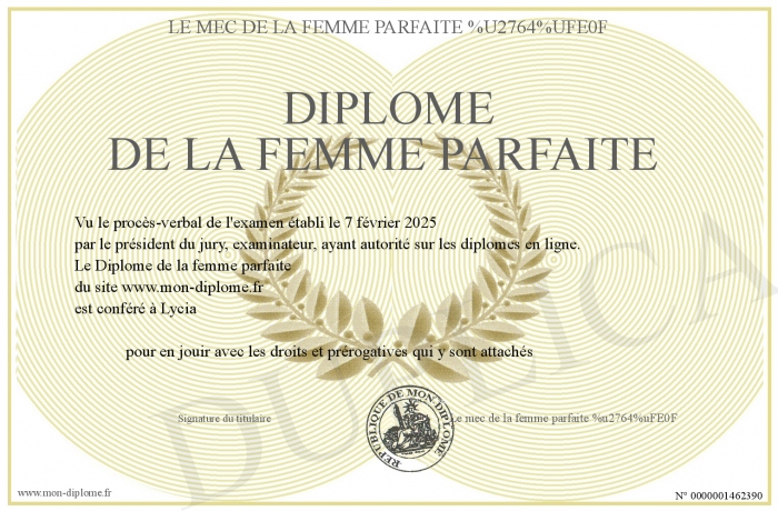 Envoyez par email votre Diplôme de la femme parfaite personalisé