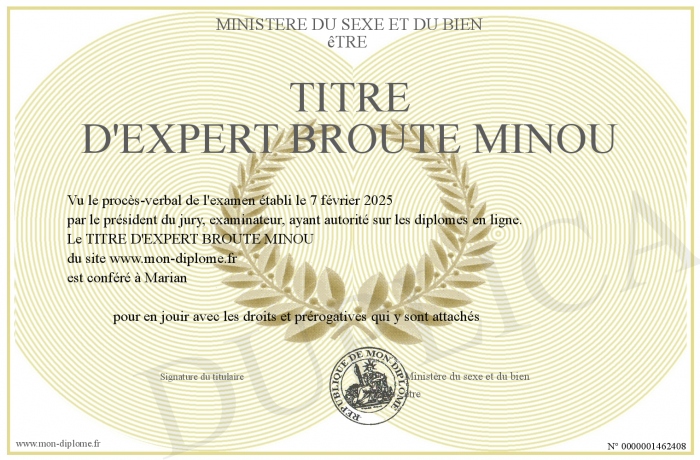 Envoyez par email votre TITRE D'EXPERT BROUTE MINOU personalisé