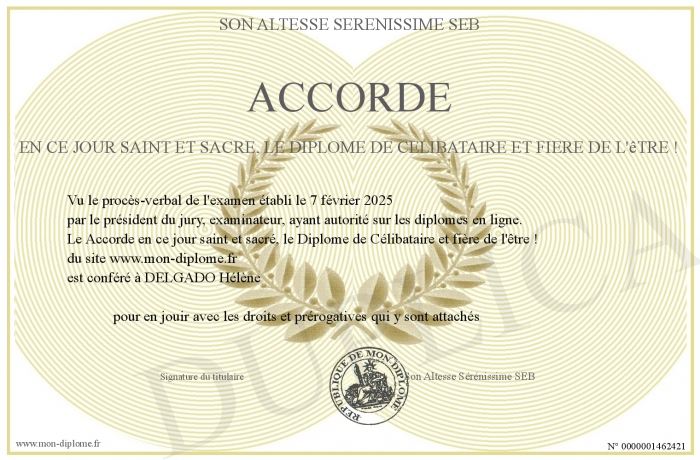 Envoyez par email votre Accorde en ce jour saint et sacré, le Diplôme de Célibataire et fière de l'être ! personalisé