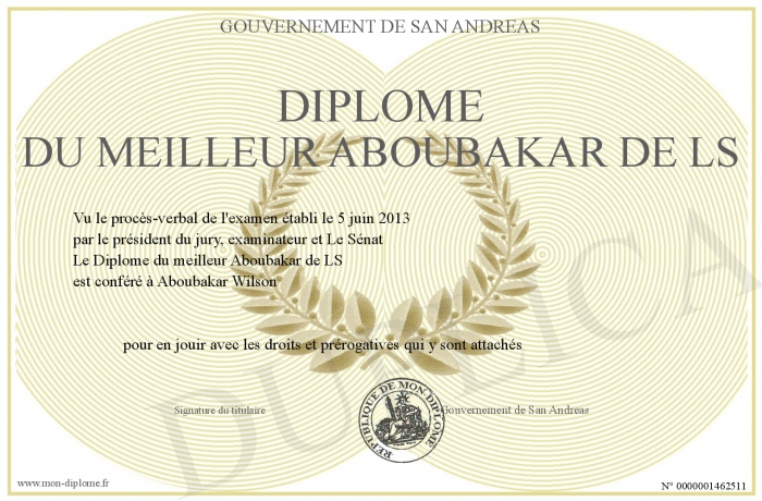 Envoyez par email votre Diplôme du meilleur Aboubakar de LS personalisé