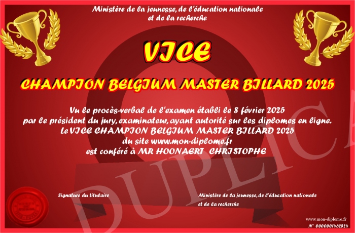 Envoyez par email votre VICE CHAMPION BELGIUM MASTER BILLARD 2025 personalisé