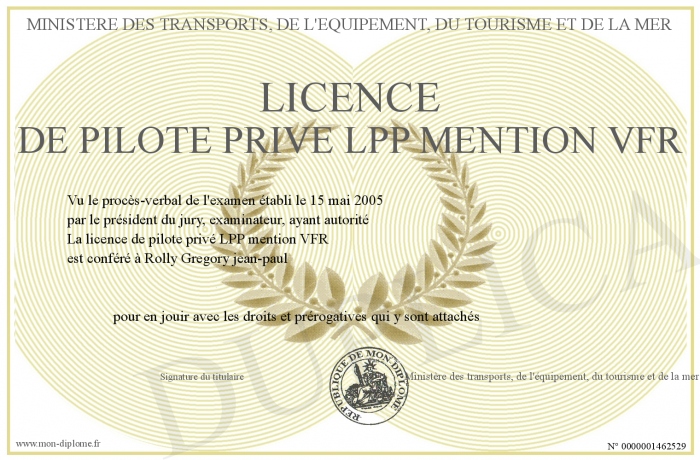 Envoyez par email votre Licence de pilote privé LPP mention VFR personalisé