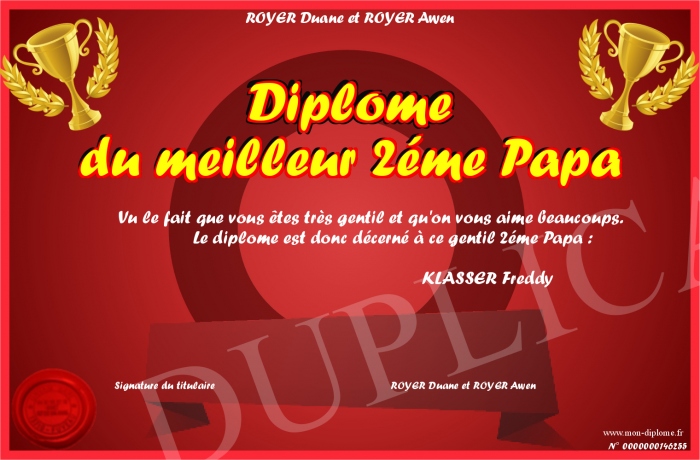 Envoyez par email votre Diplôme du meilleur 2éme Papa personalisé