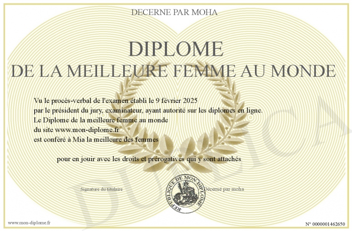 Envoyez par email votre Diplome de la meilleure femme au monde personalisé