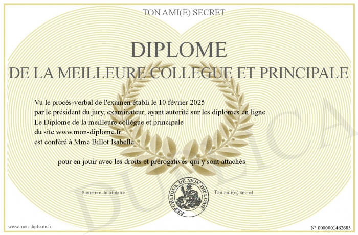 Envoyez par email votre Diplôme de la meilleure collègue et principale personalisé