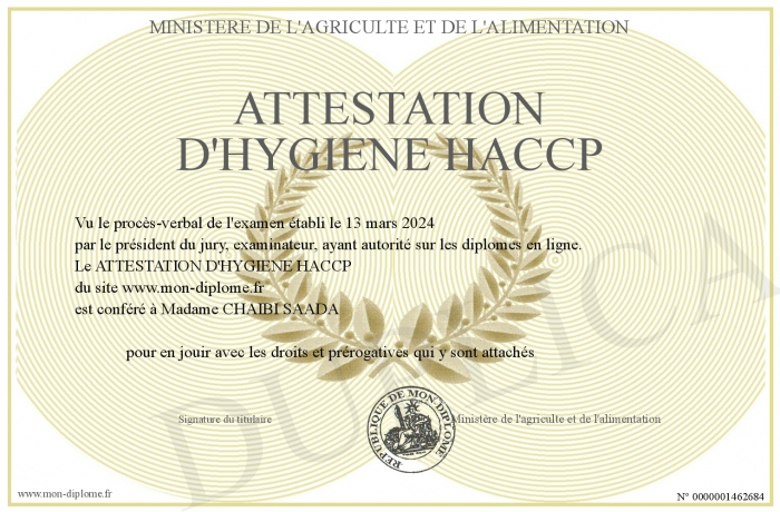 Envoyez par email votre ATTESTATION D'HYGIENE HACCP personalisé
