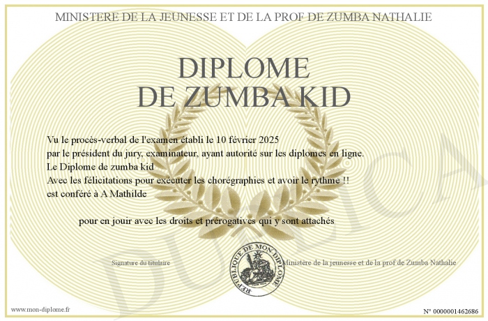 Envoyez par email votre Diplôme de zumba kid personalisé