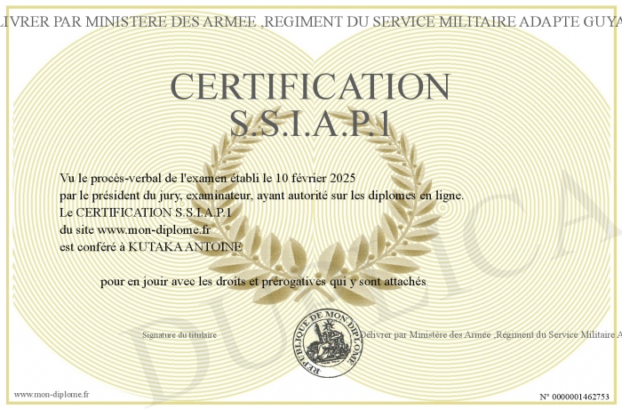 Envoyez par email votre CERTIFICATION S.S.I.A.P.1 personalisé