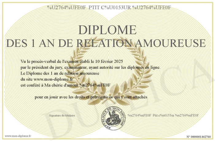 Envoyez par email votre Diplôme des 1 an de relation amoureuse personalisé