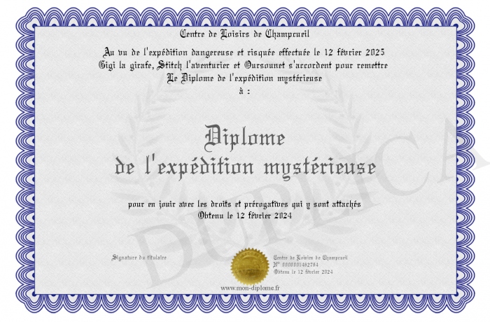 Envoyez par email votre Diplôme de l'expédition mystérieuse personalisé