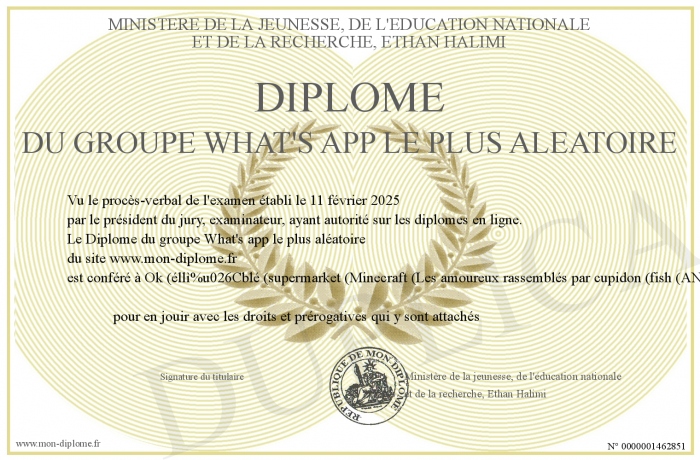 Envoyez par email votre Diplôme du groupe What's app le plus aléatoire personalisé