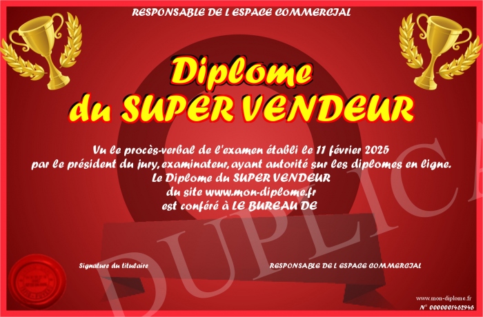 Envoyez par email votre Diplôme du SUPER VENDEUR personalisé