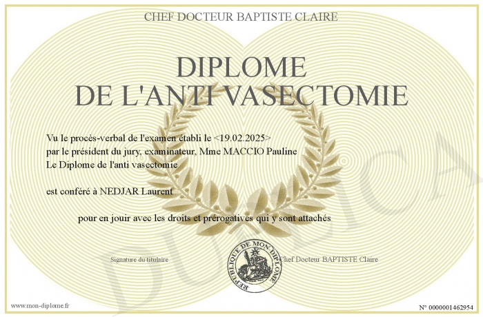 Envoyez par email votre Diplôme de l'anti vasectomie personalisé