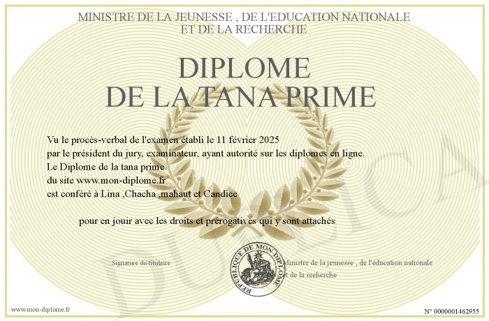 Envoyez par email votre Diplôme de la tana prime personalisé