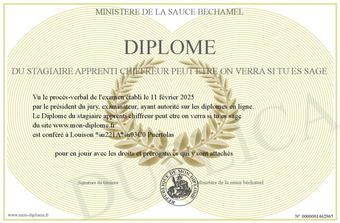 Envoyez par email votre Diplôme du stagiaire apprenti chiffreur peut etre on verra si tu es sage personalisé