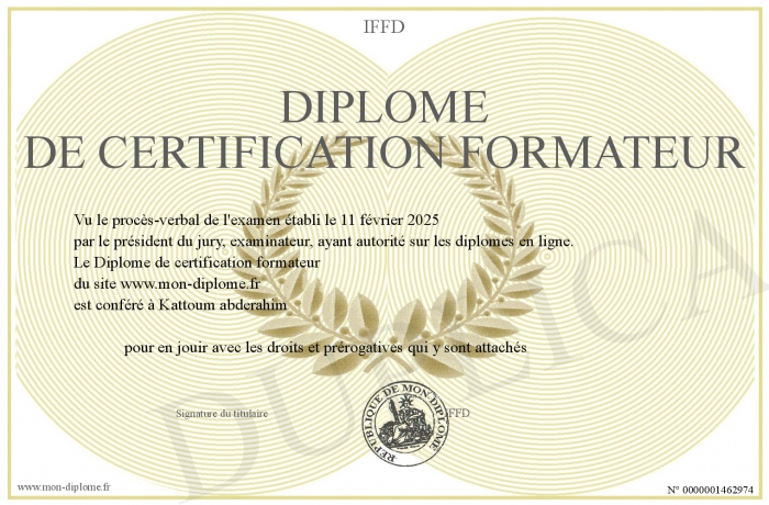 Envoyez par email votre Diplôme de certification formateur personalisé