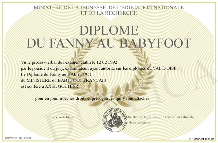 Envoyez par email votre Diplôme du Fanny au BABYFOOT personalisé