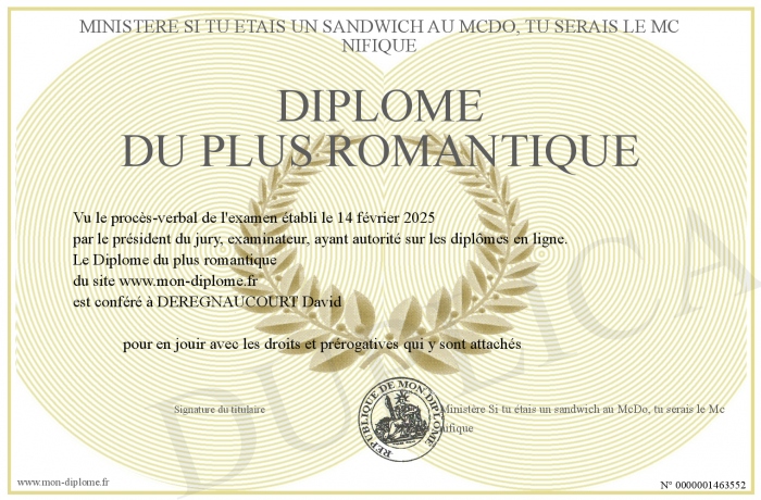 Envoyez par email votre Diplôme du plus romantique personalisé