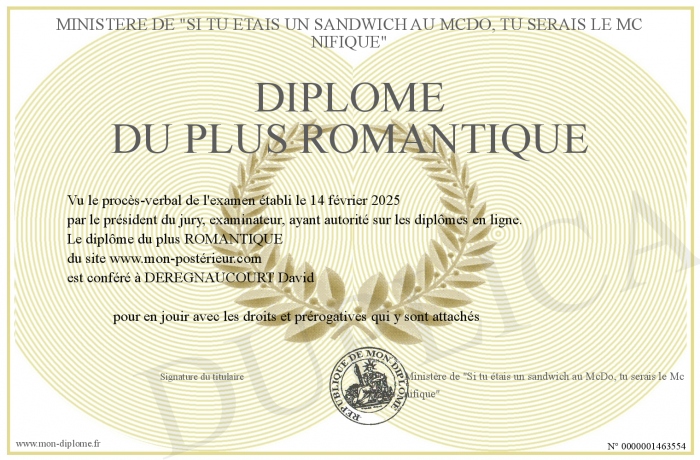 Envoyez par email votre Diplôme du plus ROMANTIQUE personalisé