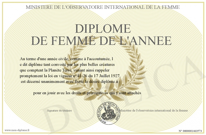 Envoyez par email votre Diplôme de femme de l'année personalisé