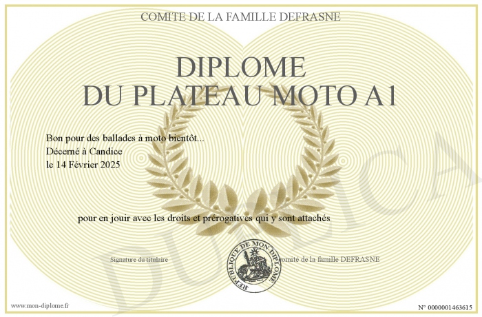 Envoyez par email votre Diplôme du plateau moto A1 personalisé