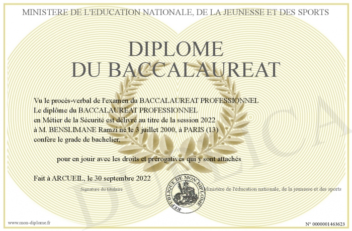 Envoyez par email votre Diplome du baccalaureat personalisé