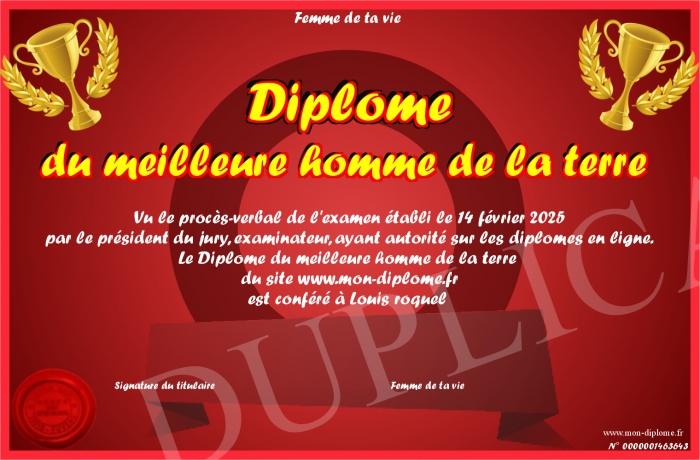Envoyez par email votre Diplôme du meilleure homme de la terre personalisé