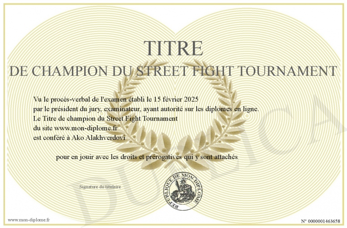 Envoyez par email votre Titre de champion du Street Fight Tournament personalisé