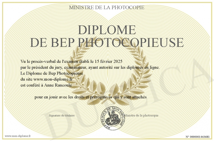 Envoyez par email votre Diplôme de Bep Photocopieuse personalisé