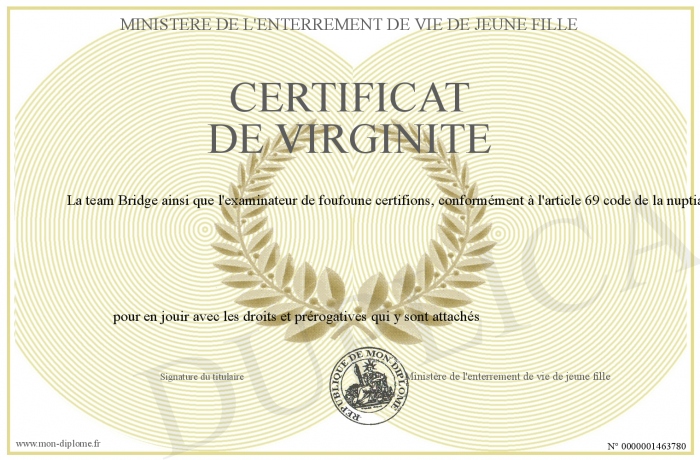 Envoyez par email votre CERTIFICAT DE VIRGINITE personalisé