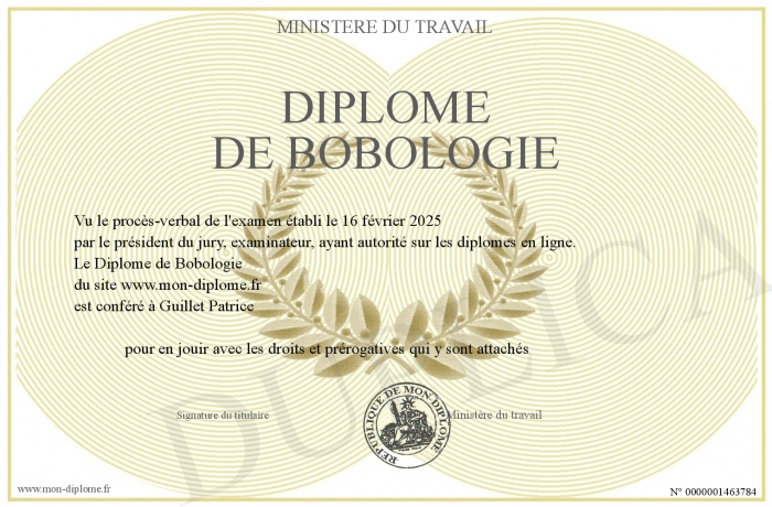 Envoyez par email votre Diplôme de Bobologie personalisé